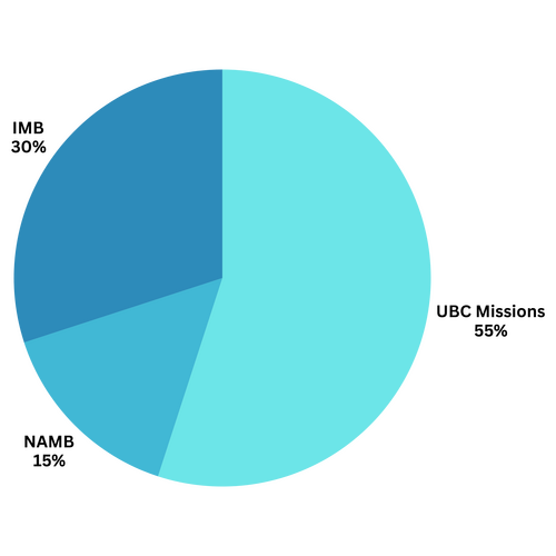 Each year around the months of February-March we have a special giving emphasis to help raise money for missions. However, you may give to the UBC missions fund at any time. Just designate your gift to "missions". All gifts to UBC’s Great Commission Offering are distributed according to the following graph.